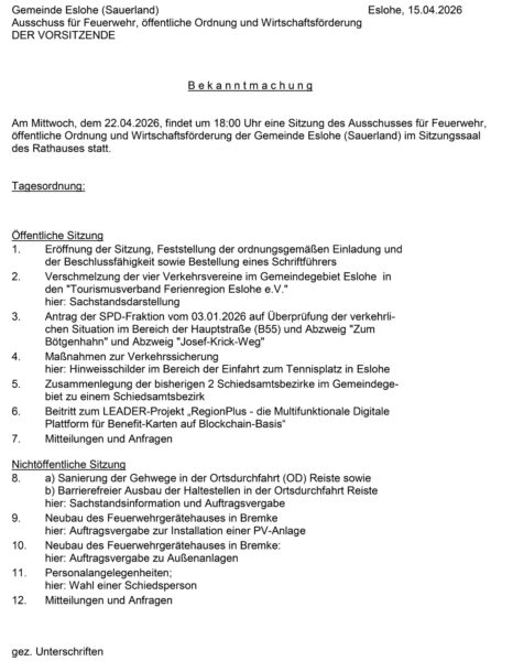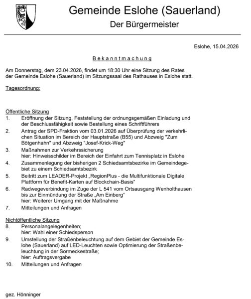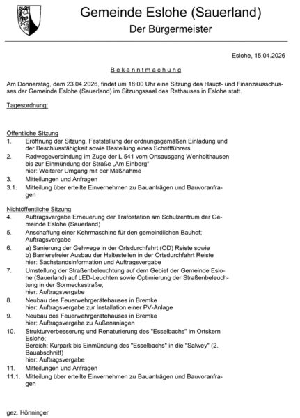 Aktuelle Bekanntmachung der Gemeinde Eslohe: