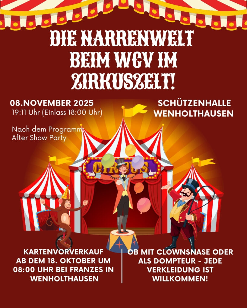 Seid dabei wenn es unter dem Motto „Die Narrenwelt beim WCV im Zirkuszelt“ wieder heißt „WCV Helau!“.