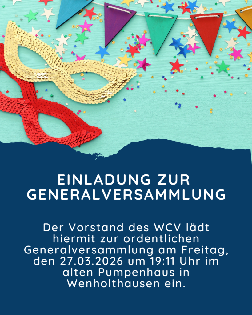 Die diesjährige Generalversammlung vom WCV findet am 27.03.2026 um 19:11 Uhr im alten Pumpenhaus in Wenholthausen statt.